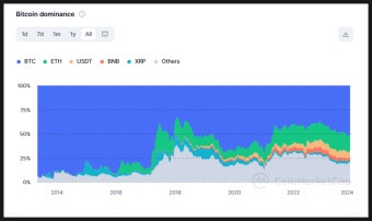 - CoinMarketCap에서는 홈페이지 상단의 ‘암호화폐 지표’ 탭에서 전체 시장 대비 비트코인의 점유율을 쉽게 확인할 수 있습니다. 다양한 시간대의 그래프를 제공하여 단기 및 장기 트렌드를 분석하기에 유용합니다.