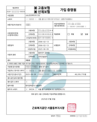 근로복지공단에서 발급하며, 사업장 명의, 사업자등록번호, 보험 가입일자, 적용 범위 등이 기재되어 있죠.
