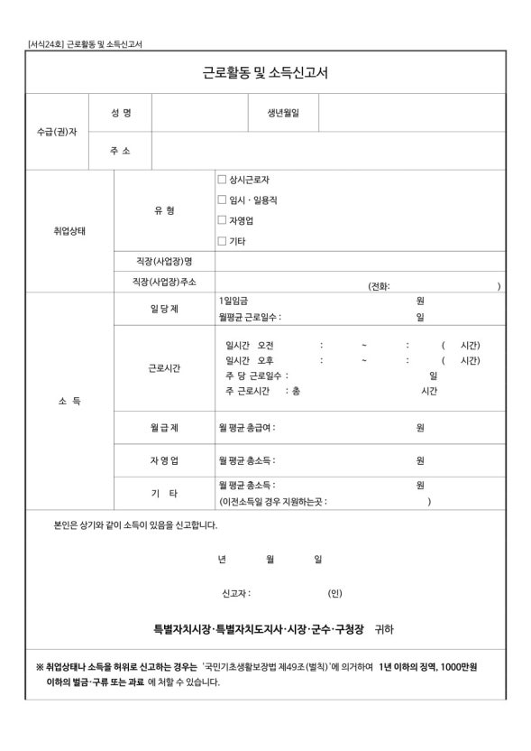 또한 소득이 없는 사람, 무직자, 전업주부, 학생 등도 소득 없음·근로 활동 없음 등의 내용을 기재해 제출해야 각종 제도 참여가 가능합니다.